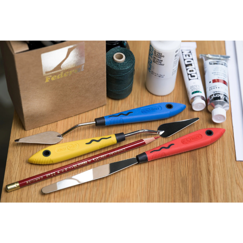 A comfortable twist on a classic tool. The RGM Soft Grip Palette Knife features a flexible, electroplated steel blade paired with a bright blue rubberized handle for a secure, comfortable grip. It’s a colorful upgrade to the traditional wood and metal design — perfect for extended painting sessions or a splash of fun in your toolkit.